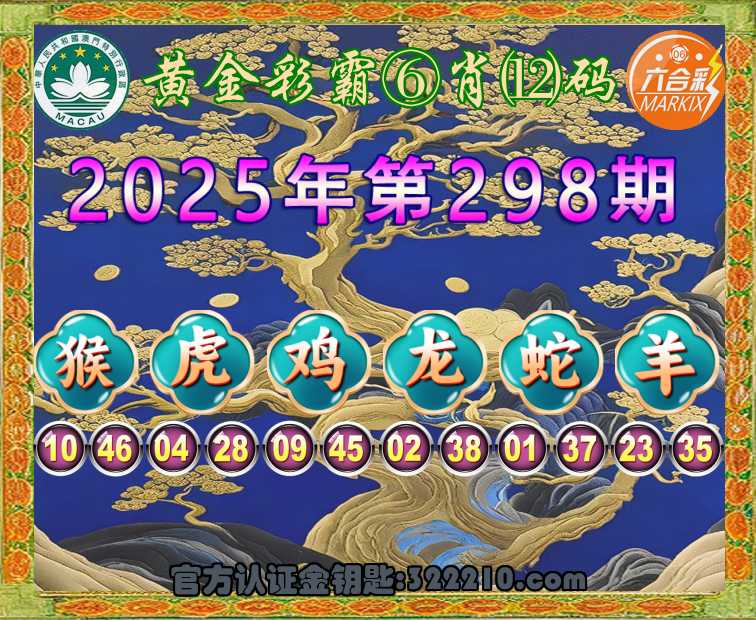298期:〖黄金彩霸〗 🥉⑥肖⑿码🥉【猴虎鸡龙蛇】开:羊23